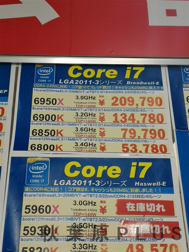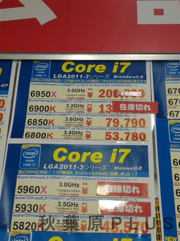 今回発売されたのは4品番で上位から6950X、6900K、6850K、6800Kだ。Core i7シリーズでは初となる10コア/20スレッドの6950Xは価格が20万円オーバーとなっており、パッケージも従来の紙箱ではなく黒色マット調の仕上がりと差別化が行われている。この6950Xは通称クロバコやクロと呼ばれているようで、パーツショップ店内でも同様の単語が飛び交っていた。