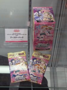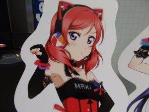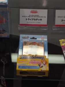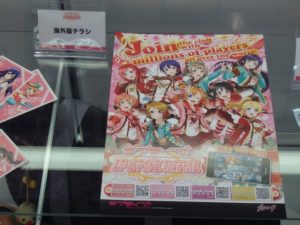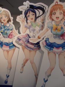 最初はサンシャイン!!で出てくる9人のメンバーを見てもらった。次のエリアに進むとスクフェスの年表やカードゲーム関連のグッズ等の展示がある。