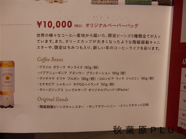 まずはTULLY’S COFFEE 秋葉原UDX店から。ハッピーバッグは恒例となっている3,000円、5,000円、10,000円の3種類(それぞれ税込み)が今年も用意されるようだ。そして福袋の「袋」となっているトートバッグは色を選べるのが特徴だ。年末から予約を受け付けているのだが、残念なことに10,000円の福袋は規定数量に到達したとのことで予約できなくなっていた。