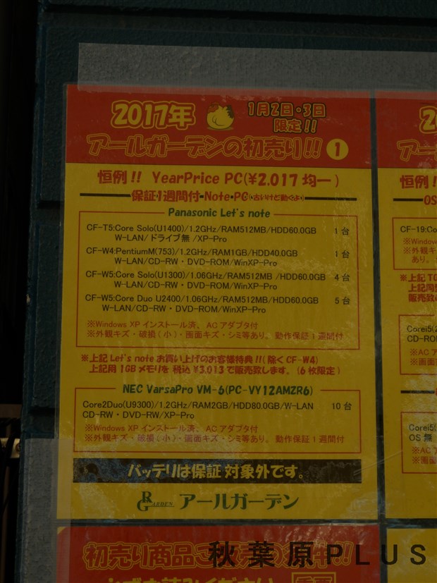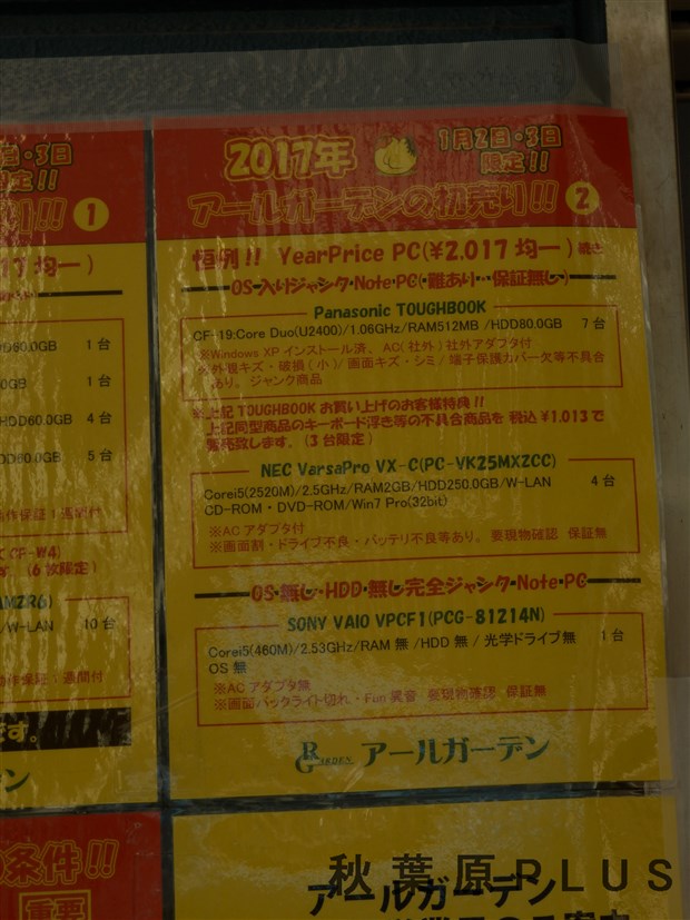 中古パソコンなどを扱うアールガーデンでは2,017円でPanasonicのノートパソコン「レッツノート」「TOUGHBOOK(タフブック)」、NECの企業向けノートPC「VersaPro」などを1月2日から数量限定で販売予定だ。(POPに記載されているVarsaProは誤記だろうか・・・)