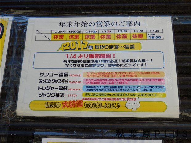 サンコーレアモノショップでは恒例のジャンク福袋のほかにサンコー福袋や、あったか福袋が用意されるようだ。個人的にはトレジャー福袋が気になるところ。初売りは1月4日からのようだ。※2号店は1月5日から