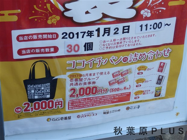 最後は東京では唯一のカレーハウスCoCo壱番屋(ココイチ)が展開するラーメン屋、麺屋ここいち秋葉原店から。ココイチ共通の福袋となっており、2,000円分の金券とレトルトカレーのセットで税込み2,000円だ。