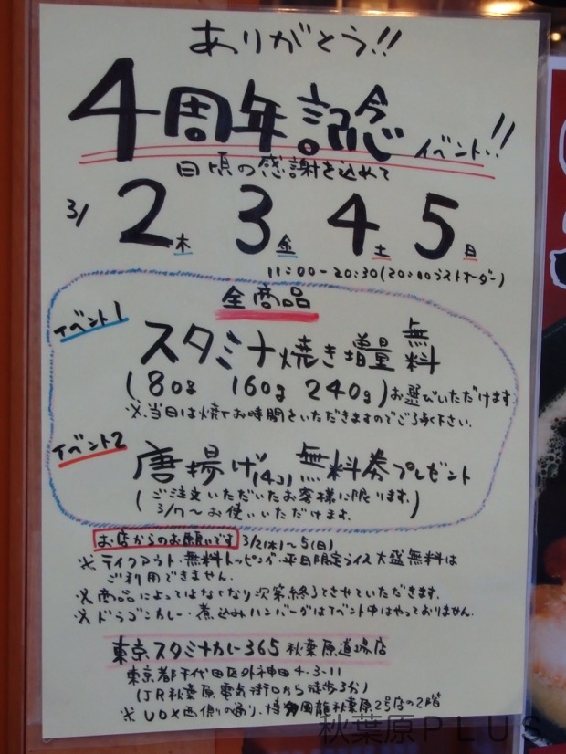 隣のスタミナカレー365では週末は4周年イベントだった模様。