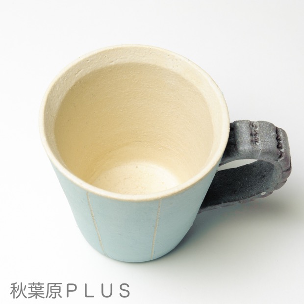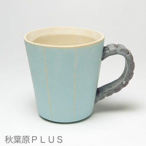 こちらがそのマグカップ。継続高校の制服を連想するカラーの釉薬と、戦車の履帯をモチーフにした持ち手が特徴的な一品だ。