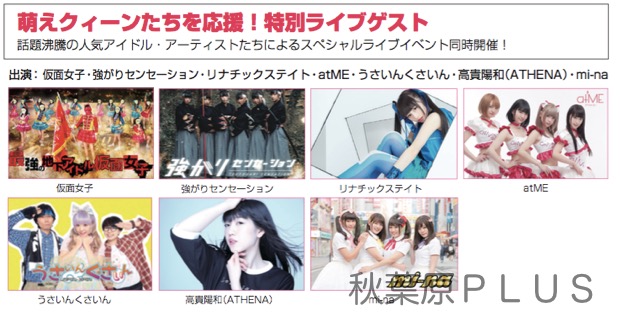 『第6回 国民的萌えクィーンコンテスト』の決勝だけでなく、審査中の時間を使ってのスペシャル応援ゲストのライブも開催。こちらは仮面女子をはじめ、強がりセンセーション、リナチックステイト、atME、うさいんくさいん、高貴陽和(ATHENA)、mi-naと「萌えクィーンコンテスト」ならではのゲストが目白押しだ。
