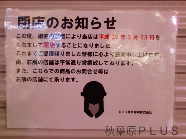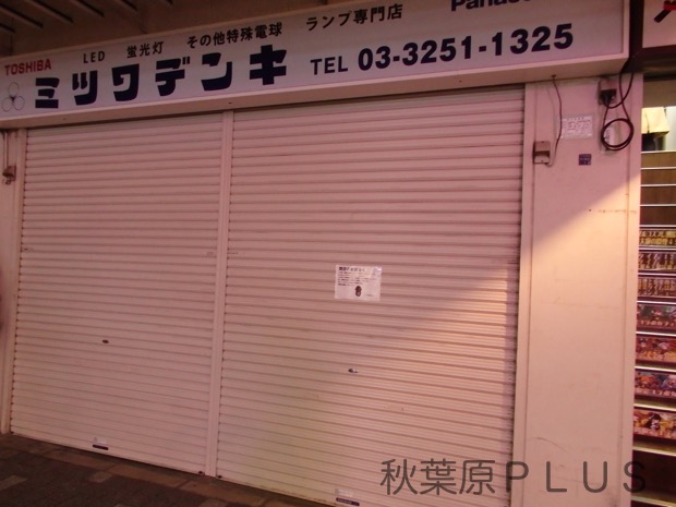 続いては店舗縮小で閉店だと思われるが、ミツワデンキのランプ専門店が閉店。他の店舗と統廃合された模様。