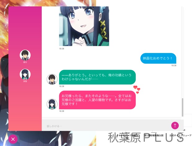 期間は『劇場版 魔法科高校の劣等生 星を呼ぶ少女』のオフィシャルサイト(http://mahouka.jp/sp/)にて2017年6月9日(金)12:00から6月25日(日)24:00までの17日間限定で公開。今回は複数のキャラクターとのグループ・チャットも実現。PCおよびスマートフォンからAI化した最強兄妹・司波達也&司波深雪とチャットルームで心ゆくまで会話を楽しむことが可能だ。また、司波達也(CV:中村悠一)、司波深雪(CV:早見沙織)によるボイススタンプ機能も付いているので会話の一部で声が聞こえるので是非自宅でゆっくり楽しんでほしい。