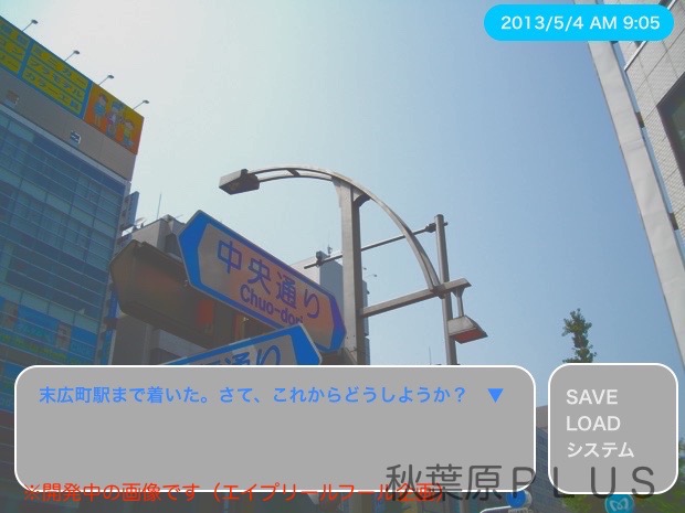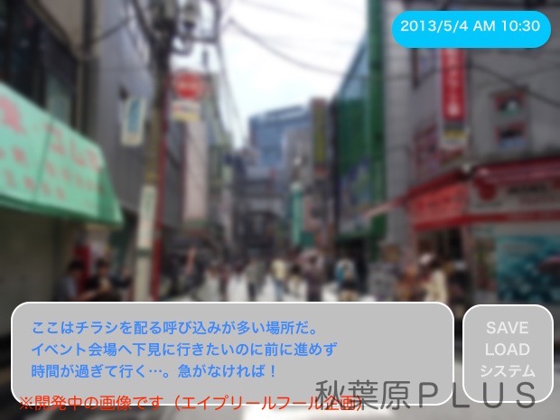 今回発表になったのは「秋葉原PLUSゲーム(仮)」だ。まだタイトルは暫定との事で今後の正式発表が待たれる。ゲームのジャンルは擬似リアルタイムAVGという事で、コマンドなどの入力によってゲーム内時間が進むAVG形式の擬似リアルタイム制を採用ている。