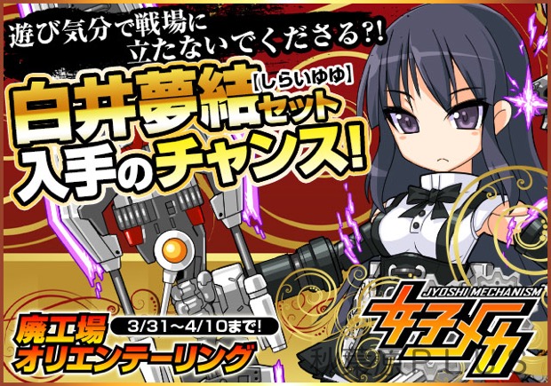 「にじよめ」で好評配信中のブラウザゲーム「女子メカ」と『アサルトリリィ』のコラボが実現! アサルトリリィの「白井 夢結」が 「女子メカ」(にじよめ)に再び電撃参戦。2017年3月31日から開催されるイベント「廃工場オリエンテーリング」のクリア報酬として登場するので、しっかりイベント完走して一騎当千のリリィ「白井 夢結」を手に入れよう! また、お得なアイテムセットも期間限定で販売決定!お楽しみに。