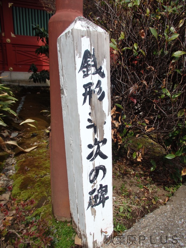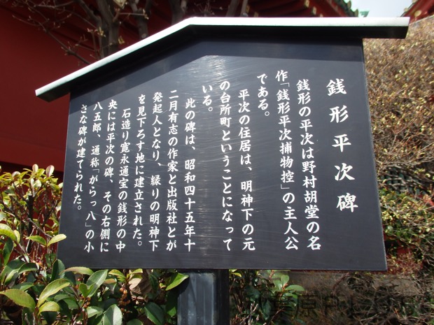 銭形平次は野村胡堂の小説『銭形平次捕物控』に出てくる架空の人物だが、秋葉原の神田明神の境内に碑が存在する。作中、平次の住居が明神下の台所町ということで、昭和45年に日本作家クラブが発起人となり碑が建てられたようだ。