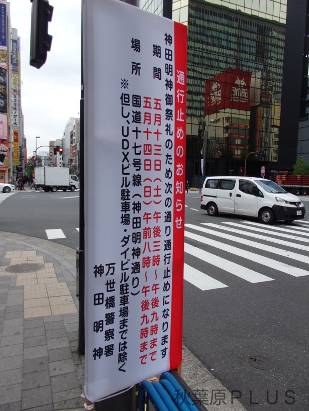 2年に1度のお祭りといえば神田祭。秋葉原に遊びにくるだけの人には馴染みがないが住んでいる住人にとっては2年に1度の晴れ舞台。秋葉原から日本橋に至る神田明神の氏子たちが待ちに待ったイベントだ。その為、秋葉原周辺も当日は通行規制が入るので注意が必要。中央通り、昌平橋通り、蔵前橋通り、の3本は神輿が行き来するので渋滞が起こりやすいので注意しよう。また中央通りは閉鎖されるので通り抜けもできないので要注意。