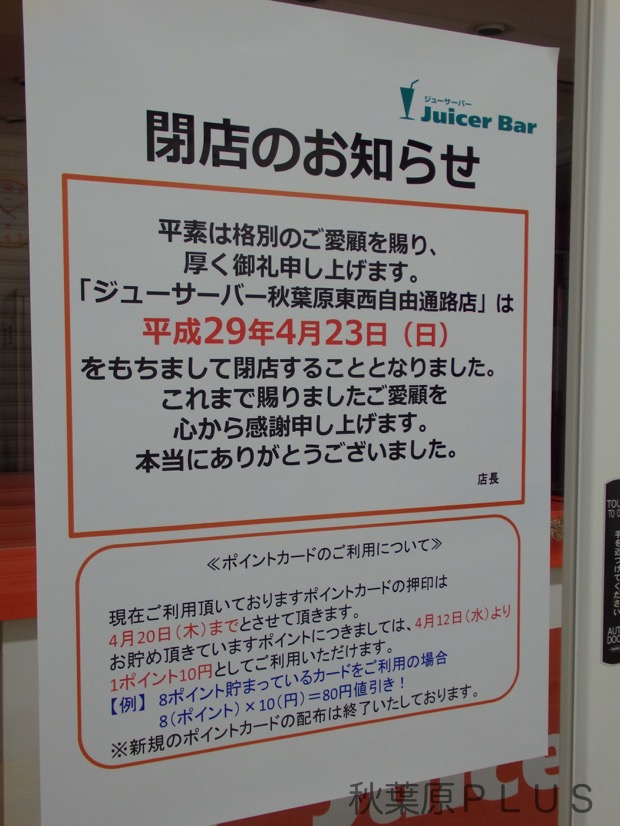 また自由通路にあったジューサーバーが日曜日の2017年4月23日で閉店。人通りは多いが商売にはなかなか難しい立地なのだろうか?