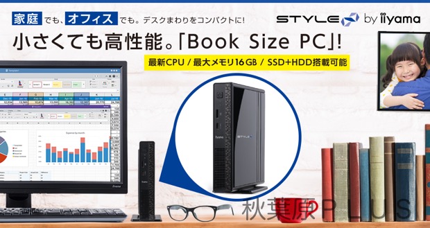 今回紹介するPCは可愛いサイズで、なんとA4(210mm×297mm)以下の約174mm×約182mm(厚さは約36mm)。スリムで省スペースなパソコンの紹介となる。お店に、自宅に、場所をとらない省スペース設計なのでどこにでも置けるのが魅力。パソコン工房のスリムケース筐体の容積15.2リットルと比較して、15分の1以下となる1リットルの筐体サイズに同等のスペックを搭載した「ギュッ」と詰まったパソコンだ。省スペースだが第7世代インテル(R) Core(TM) プロセッサーや高速無線LAN機能を搭載する他、SDXC対応のmicroSDカードリーダーやUSB3.0ポートなどパソコンを利用する上で便利な機能がしっかり搭載なので安心のパソコンだ。