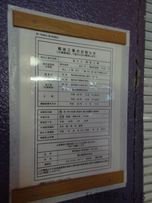 最近落ち着いて回っていなかったので少し不安だが気になった、目に付いた場所を紹介していこう。まずは昭和通り側の以前ファンファン秋葉原店が入っていたビル。結局解体となるようだ。