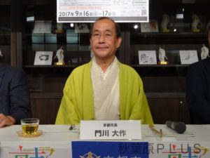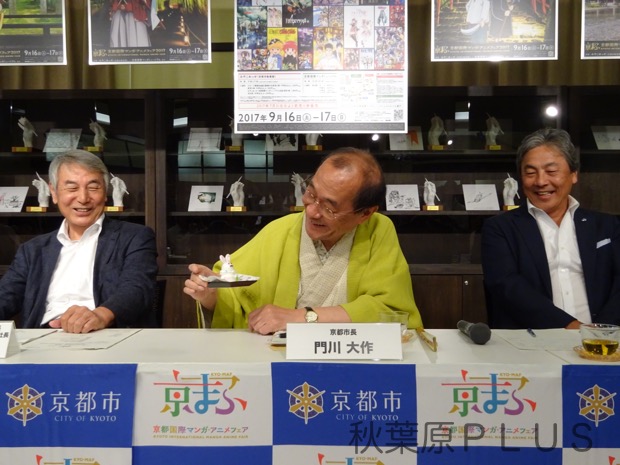 2017年で6回目を迎えた京まふ。記者会見では門川市長からは文化庁の京都への移転、機能強化に触れつつ先日改正された「法文化芸術基本法」に食文化、さらにはマンガを含めたメディア芸術という言葉が記載された現状から、文化の広がりへの思いが語られた。また13年前の京都国際マンガミュージアムの開館時と現在の状況を振り返り『「なんでマンガミュージアムや」という地元の声を説得する必要があった(開館時の)13年前と比べ、現在のマンガ・アニメというものが如何に多くの人々の支持を得て、そして世界へ広がっていったら、と実感している』と現在の状況を述べ、「京都から文化で日本中を元気にしていく。さらには文化でもってアジア、世界の平和に貢献していく」と京まふへの思いを語った。