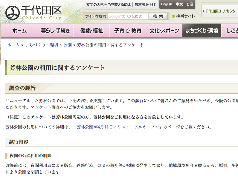 芳林公園の利用に関するアンケートが千代田区のホームページで開催中。「(注意)このアンケートは芳林公園周辺の方、芳林公園をご利用になる方を対象としています。」との事。住民以外の秋葉原を訪れる人も対象らしいので、是非アンケートを見てほしい。