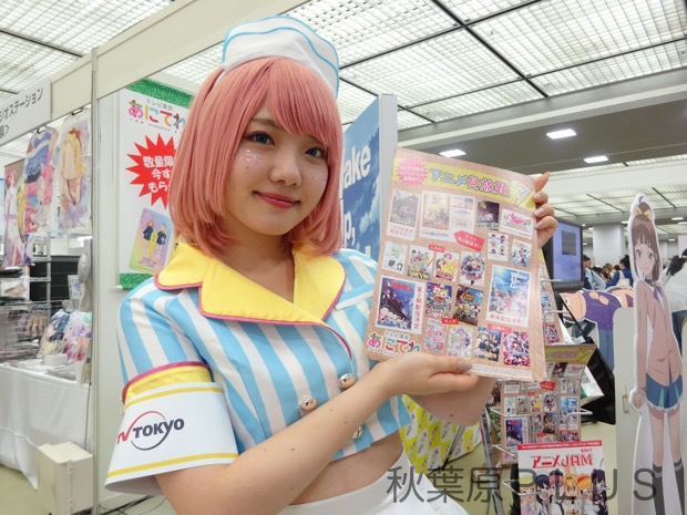 会場内では全ブーストはいかないものの、特にTV局のブースで今期放送予定のアニメのキャラクターに扮して配布物を配るスタッスが目に付いた。アニメ・マンガのイベントという事でキャラクターに扮した働くスタッフを撮影してきたので紹介していこう。写真を撮影する際には各自配布物を手に持って貰ったので、映っている配布物を参考にブースを訪ねてもらうといいかも? これがイベントの一つの楽しみ方!?