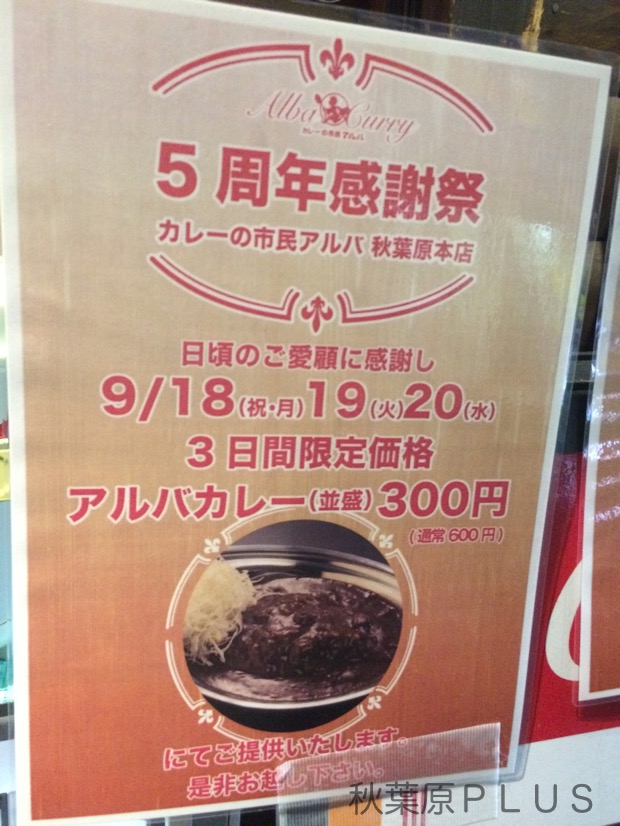秋葉原にある金沢カレーの「カレーの市民 アルバ」が5周年を迎えた。その5周年を記念してアルバカレー(並)が2017年9月18日・19日・20日の3日間限定で300円で提供されている。本日その最終日(2017年9月20日)という事で、まだ間に合う! そのカレーを食べてきたので紹介していこう。