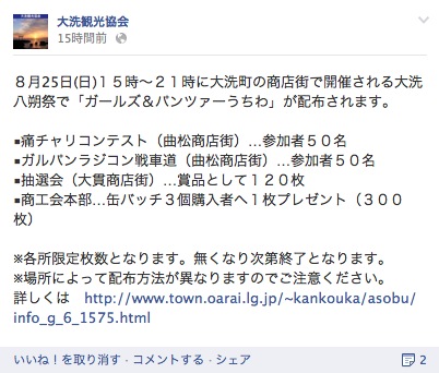 Facebookの大洗観光協会より情報が入った。