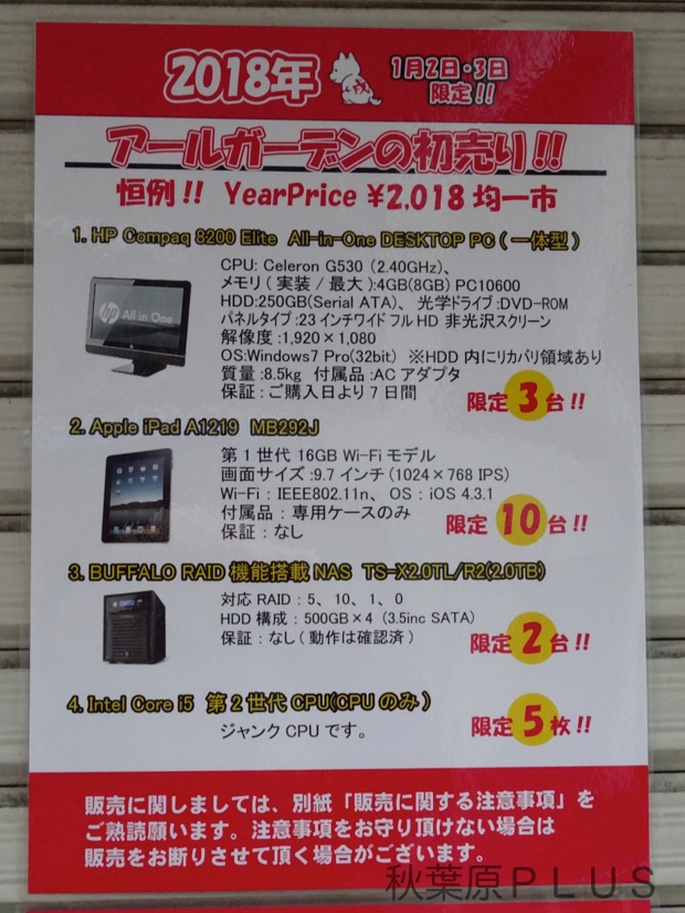 それでは大手家電量販店以外を見ていこう。まずはアールガーデン。初売りは2018年1月2日から。2018円初売りを行う模様。お釣りの注意事項をしっかりチェックしていこう。