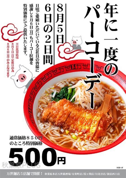 なお、このイベントは秋葉原本店『万世橋酒場』(1F)だけでなく『万世麺店』有楽町店、霞ヶ関店、日比谷店、新宿西口店(旧:万世パーコーメン)でも開催されるので東京近郊の人も良ければどうぞ!