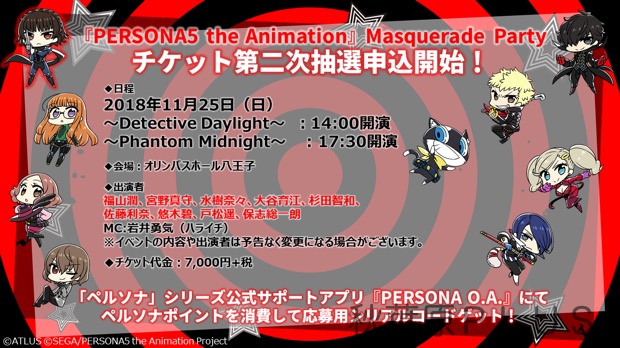 好評放送中のTVアニメ「ペルソナ5」について、2018年11月25日開催予定のメインキャスト9名全員登壇が決定しているスペシャルイベント『PERSONA5 the Animation』Masquerade Party のチケット第二次抽選申込が開始。『PERSONA O.A.』からペルソナポイントを消費して応募しよう!