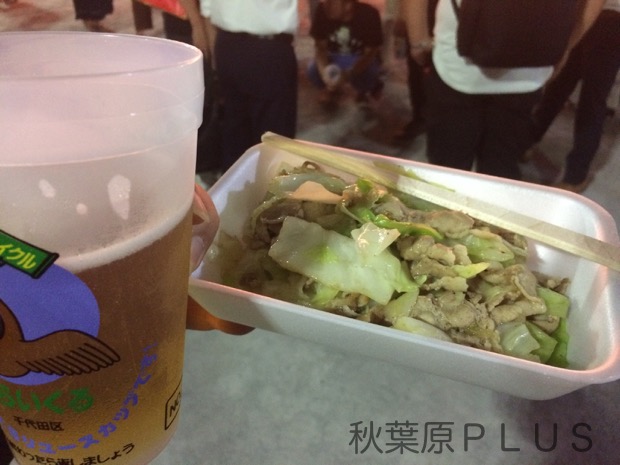 お祭りなのでビールと焼きそばは終わってしまって野菜炒め。この辺りの適当さも地元祭りならではだ。ちなみに購入は全てチケットが必要。50円単位で購入できるので小学校側の金券売り場で金券を購入して引き換えしよう! そしてメインの盆踊りはなんと飛び入りOK。演舞台の人を参考に全然知らない人も一緒に輪に入って楽しもう!