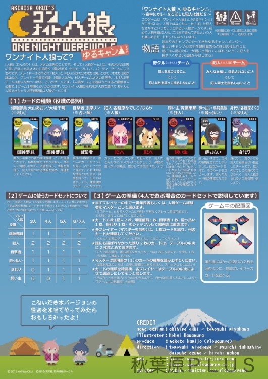 今回発売となる「ワンナイト人狼×ゆるキャン△」~夜中にカレーをこぼした犯人は誰だ!?~は、『ゆるキャン△』のキャラクターたちが泊まりでキャンプをした際に、朝ご飯のために作ったカレーの鍋が何者かによって皆が寝ている夜中に倒されてしまった、という設定となっている。人狼の代わりにカレーをこぼした犯人を捜す、のがちょっと人狼とは違うところだ。