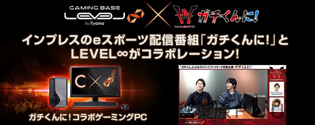 インプレス PC Watchの若杉編集長とプロ格ゲーマーのガチくん氏がMCを務める、eスポーツ配信番組「ガチくんに!」とLEVEL∞とのコラボゲーミングPC全機種が、パソコン工房Webサイトにてお得に購入できるキャンペーンだ。