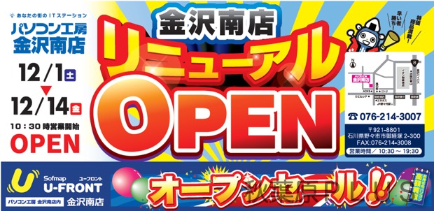 「パソコン工房 金沢南店」が2018年12月1日にリニューアルオープン!さらに店内に「U-FRONT 金沢南店」がオープン!もちろんリニューアルオープンセールを開催中!!