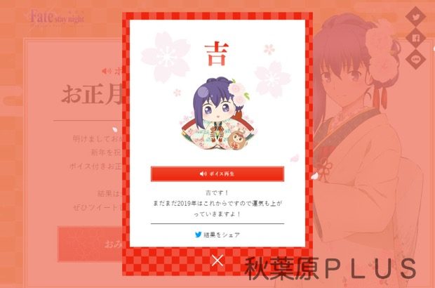 劇場版「Fate/stay night [Heaven‘s Feel]」Ⅱ.lost butterflyの 2019年1月12日第二章全国公開記念として2019年1月1日0時から3日まで期間限定公開の「 新年 間桐桜ボイス付きおみくじ」で運だめしだ!