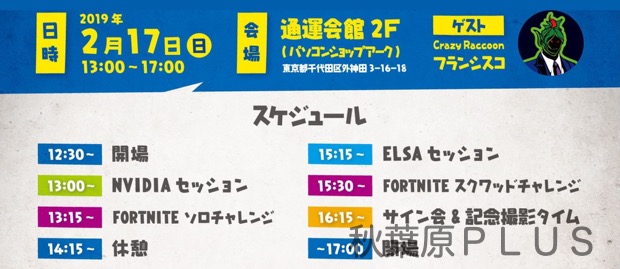 秋葉原 通運会館2F(パソコンSHOPアーク上)にて、ゲーミングPC LEVEL∞(レベル インフィニティ)を使用して、FORTNITEゲームプレイイベントを実施します。プロゲーマー Crazy Raccoon フランシスコ選手を迎えたハイレベルなソロプレイ観戦や、ゲーミングスマートフォンを使用したイベント参加のお客様を交えたパーティプレイも実施します。更に、見事にビクロイ(Victory Royale:バトルロイヤルで最後まで生き残り優勝)した際には、豪華賞品が貰えるじゃんけん大会も開催致します。