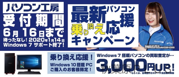 全国のパソコン工房・グッドウィルの店舗、インターネット通販、法人営業部にて、2019年6月16日(日)までの期間限定で、Windows7からWindows10への乗り換えの際のWindows7搭載パソコンの買取査定が3,000円増額、または、証明書付きのデータ消去サービスが無料となる下取りキャンペーン『最新パソコン乗り換え応援キャンペーン』を開始した。