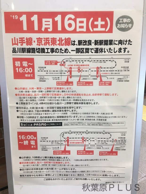 今日(2019年11月16日)は山手線・京浜東北線の切り替え工事に伴い秋葉原に直接来れない!? というわけで、秋葉原に来るにはどうしたら良いか? そんな貴方にJR以外の最寄駅を紹介していこう。