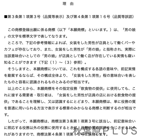 商標というのは「その言葉を聞いたらあの商品とわかる呼称」を登録する、という大雑把な認識でいただければ良い。例えば「マツモトキヨシ」と言えば薬局という形だ。単なる人物名である「マツモトキヨシ」さんが使っても権利侵害にならないのは役務という「効果の及ぶ業種、業界や物体」が細かく決められているからだ。また、今回の「男の娘」は標準文字での権利取得となっている。例えばこれが「特殊な形態をした文字」で取得した場合、他の業者が「男の娘」を使っても文字の形が異なれば権利は侵害しない。しかしながら今回は標準文字ということで、文字の形などは関係なく「男の娘」という単語を使った時点で権利侵害となる。ポイントは「役務」という効果の及ぶ範囲と対象の文字列となる。