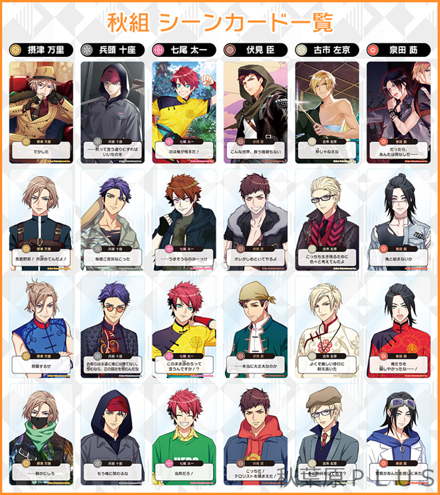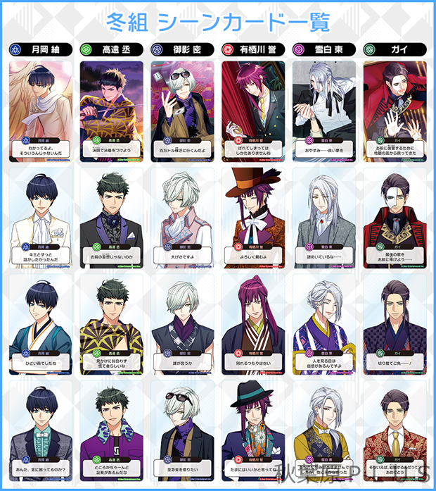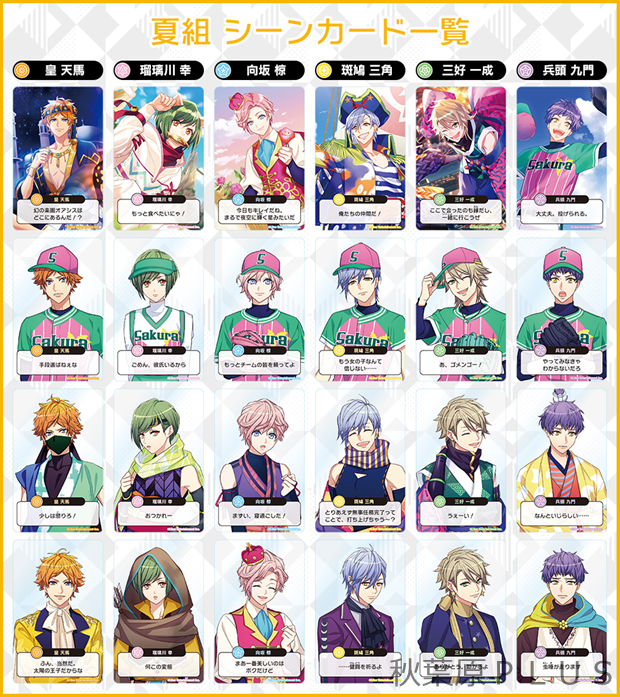 公式サイトにて、劇団員が描かれた全96種のシーンカードの絵柄をすべて公開中。カードには、各劇団員が主演を務めた公演イラストと、第四回から第六回の公演イラストに合わせたセリフがデザインされている。
