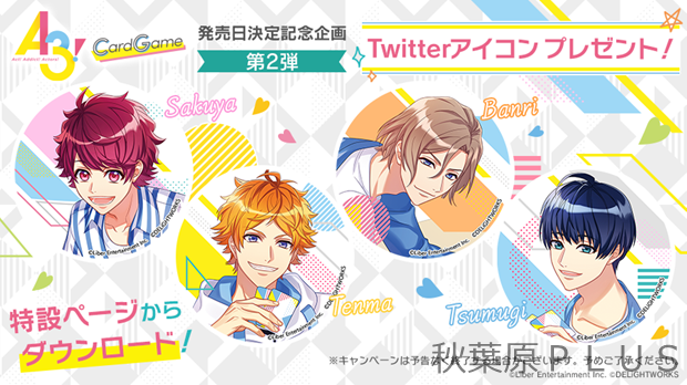 本カードゲームの発売日決定を記念して、2つのキャンペーンを実施。一つは「Twitterアイコンプレゼント」だ。本カードゲームのパッケージなどに使用されているキービジュアルを用いたTwitterアイコンをプレゼント。アイコンは、「佐久間咲也(さくまさくや)」、「皇 天馬(すめらぎてんま)」、「摂津万里(せっつばんり)」、「月岡 紬(つきおかつむぎ)」の全4種類となっている。