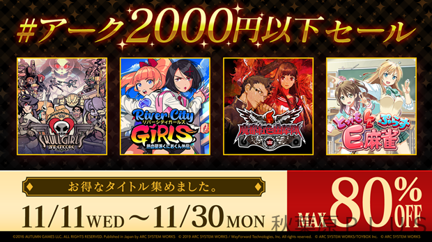 2020年11月11日(水)よりアークシステムワークスのソフトが最大80%OFFでお得にお買い求めいただける『#アーク2000円以下セール』を開催中だ。お得なタイトルを集めた本セールでは、殴って蹴って踏みつぶすガールズアクションゲーム「熱血硬派くにおくん外伝 River City Girls」が38%OFFの1,977円、カートゥーン美少女が大暴れする格闘ゲーム「スカルガールズ 2ndアンコール」が72%OFFの1,293円など、小粒でもピリリと辛いタイトルをお得な価格で購入できるチャンスとなっている。