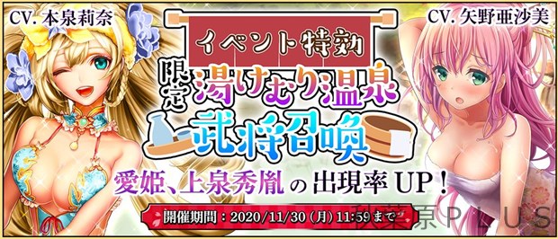 部隊編成に入れると、温泉イベント「束の間の湯けむり温泉」で獲得するイベントポイントが増える武将がピックアップされた「限定温泉武将召喚」を開催!