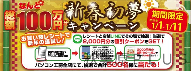 また、全国のパソコン工房店舗では1月1日(金・祝日)から1月11日(月・祝日)までのキャンペーン期間中、お買い上げレシート&店舗LINEで、「2000円分の値引きクーポン」が当たる抽選会にその場で参加可能!全店にて、抽選で合計500名様・総額100万円分が当たるビッグチャンスだ!ぜひパソコン工房初売りで新年の運試しをお楽しみもう!