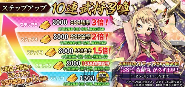 通常の武将召喚よりもSSR武将が手に入りやすく、4周目のステップ5でSSR森蘭丸が必ず獲得できる「ステップアップ武将召喚」を実施中。今回のステップアップ武将召喚は5ステップを4周することができる。ステップ1とステップ2ではいつもよりお得に10連武将召喚を行うことができ、さらに2周目、3周目のステップ5では10連目にSSR武将が確定で1体以上出現し、4周目のステップ5では新武将「【SSR】森蘭丸」が確定で出現! この機会を上手く使おう!