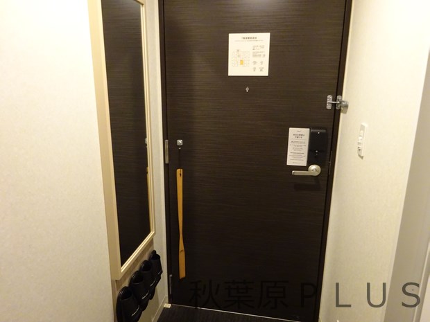 今回宿泊した部屋の様子や備品などを見ていこう。なお、この日は2020年11月現在の様子となり、他の部屋では設備等が異なることがある点は注意してほしい。入口には姿見と靴ベラ、そしてスリッパが置いてある。