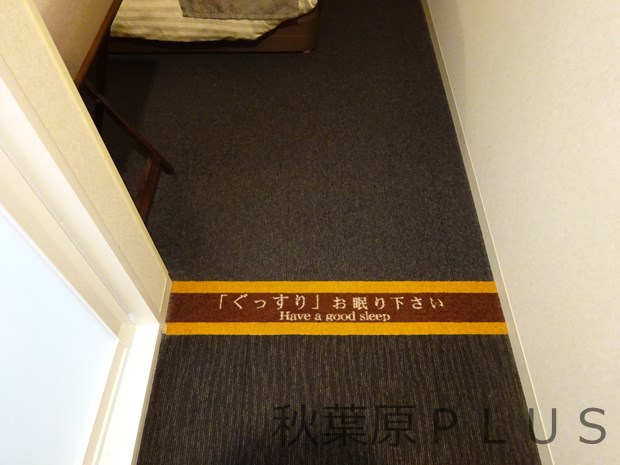 そして部屋の方を見ると『「ぐっすり」お眠りください』のラインが室内と外を分けている。それでは部屋へ入っていこう。