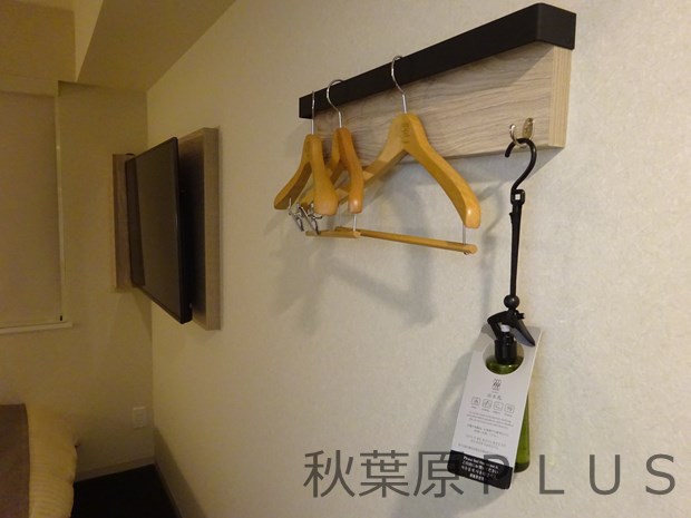 まずはハンガーチェック。3本と少し少な目の本数。その代わり室内にフックがあるので上着などはそこにかけると良いだろう。その横には除菌消臭スプレーがあり、奥にはテレビとコンパクトにまとまっている。