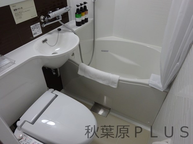 それではバスルーム&トイレへ。大浴場があるのだが、部屋にもしっかりと浴槽を完備。他人と一緒に入りたくない、疲れているのでシャワーで済ませたい、などの需要にもしっかりと対応。大浴場があるホテルは浴槽が小さめの場所も多いが、比較的広めのしっかりとした浴槽なのでお湯に浸かって一日の疲れを取るのにも十分だ。