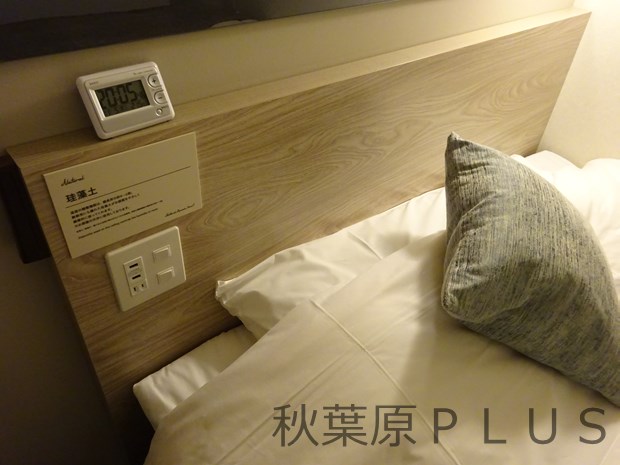 枕はロビー脇に置いてある様々な枕から好みのものを持ち込んでもOK。数量限定なので、お気に入りや狙いの素材がある場合はチェックインは早めに行いたいところだ。ベッド脇には照明パネルとUSBコンセント。スマホを充電しつつ横になることができる。