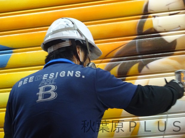 秋葉原駅前の旧ヤマダ電機のテナントだったビルのシャッターにイラストが登場。しかし、いつもと違う。えっ! シャッターにエアブラシ1本で直接描いている!? そんな状況が気になり早速現場で話を聞いてみた。