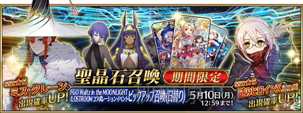 2021年4月26日(月)20:30から5月10日(月)12:59まで、「FGO Waltz in the MOONLIGHT/LOSTROOM コラボレーションイベントピックアップ召喚(日替り)」(以下、本ピックアップ召喚)を開催。本ピックアップ召喚では、本イベントで活躍する期間限定サーヴァント「★5(SSR)ミス・クレーン」が新たに登場し「★5(SSR) 謎のヒロイン X〔オルタ〕」とあわせて日替りでピックアップし、「★4(SR)ニトクリス(キャスター)」「★3(R)静謐のハサン」を常時ピックアップ。また、期間限定概念礼装の「★5(SSR)フラワー・サンシャイン」「★4(SR)カルデア・スターズ」「★3(R)キャメロット・レッスン」も常時ピックアップいたします。これらの概念礼装を装備することで、本イベントにおける「イベントアイテム」のドロップ獲得数がアップ。