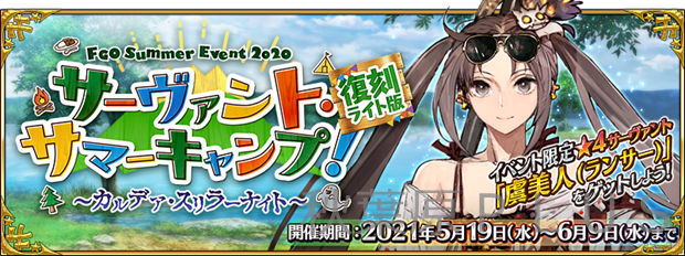 スマートフォン向けFateRPG『Fate/Grand Order』にて、2021年5月19日(水)18:00(予定)から6月9日(水)12:59までの22日間、期間限定イベント「復刻:サーヴァント・サマーキャンプ! ~カルデア・スリラーナイト~ ライト版」(以下、本イベント)を開催。あわせて、同期間に「復刻 サーヴァント・サマーキャンプ!ピックアップ 1 召喚(日替り)」と、「復刻 サーヴァント・サマーキャンプ!ピックアップ男性召喚(日替り)」も開催する。