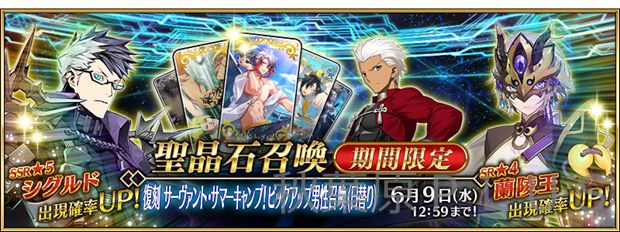 2021年5月19日(水)18:00(予定)から6月9日(水)12:59まで、2020年に開催した「サーヴァント・サマーキャンプ!ピックアップ男性召喚(日替り)」の内容を一部変更し、「復刻 サーヴァント・サマーキャンプ!ピックアップ男性召喚(日替り)」を開催。本イベントに関連する期間限定サーヴァント「★5(SSR)シグルド」を常時ピックアップし、「★4(SR)蘭陵王」「★4(SR)エミヤ」を日替りでピックアップ。また、期間限定概念礼装の「★5(SSR)イノセント・ブルー」「★4(SR)クライミング・バトル」「★3(R)マブダチ・バーベキュー」も常時ピックアップいたします。これらの概念礼装を装備することで、本イベントにおける「イベントアイテム」のドロップ獲得数がアップする。